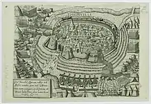 On 17 April Vieilleville's first troops arrived outside the town walls and dug siegeworks at key points, cutting off the food supply to the city. On 26 April the German troops arrived, along with the other French reinforcements sent by Imbert de Bourdillon, allowing the town to be completely surrounded. Early in May Guise sent a message demanding that the seigneur de Vieilleville await his arrival with a further 400 men at arms, 500 light cavalry and 1,000 mounted arquebusiers - he and Piero Strozzi finally arrived at the town on 28 May. This meant that the French force now totalled around 12,000 men[2]