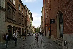 The street was part of a former trading route between Wieliczka, Tarnów and Lwów.[1] After the junction near the Planty Park, the street extends as Starowiślna Street. Its former name was Zwierzęca Street (Ulica Zwierzęca, lit. Animal Street) due to nearby slaughter houses. The street would also be known as Szkolna Street (Ulica Szkolna, lit. School Street) due to the former existence of a nearby school devoted to the Virgin Mary.[2]