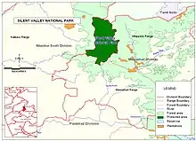 Silent Valley National Park is a national park in Kerala, India. It is located in the Nilgiri hills and has a core area of 89.52 km2 (34.56 sq mi). It is surrounded by a buffer zone of 148 km2 (57 sq mi). This national park has some rare species of flora and fauna. Silent Valley National Park was explored in 1847 by the botanist Robert Wight.[2] It is located in the border of Mannarkkad Taluk of Palakkad district, Nilambur Taluk of Malappuram district, Kerala, and Nilgiris district of Tamil Nadu.