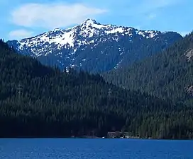 Silver Peak is a prominent 5,605 ft (1,710 m) mountain located in eastern King County of Washington state. It is set on the crest of the Cascade Range, on land managed by Mount Baker-Snoqualmie National Forest. Silver Peak is situated 4.5 miles southwest of Snoqualmie Pass, and three miles west of Keechelus Lake. The Pacific Crest Trail traverses its east flank and provides easiest access. The nearest higher neighbor is Granite Mountain, 3.98 miles (6.41 km) to the north-northwest.[1] Precipitation runoff from the east side of the mountain drains into Cold Creek, a tributary of the Yakima River, whereas the west side of the mountain drains into the South Fork Snoqualmie River via Humpback Creek.