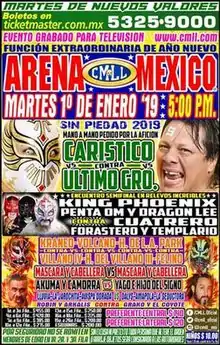 Starting in 2011 CMLL has been promoting a New Year's Day show with bigger, more prominent and promoted matches, although they did not specifically promote the shows under a special event name, they were simply a special version of their weekly Arena Mexico shows. Starting in 2011 CMLL added at least one high-profile match to their shows, slowly building them into a special event. in 2011 the show featured the annual Reyes del Aire ("Kings of the Air") tournament, won by Ángel de Oro.[5] In 2012 the January 1 show saw Hombre Bala Jr. and Super Halcón Jr. defeated the team known as Los Rayos Tapatío in a Luchas de Apuestas, masks vs masks match in what turned out to be Los Rayos last match in CMLL.[6] The main event of the 2012 was the finals of a tournament for the vacant CMLL World Heavyweight Championship which was El Terrible defeat Rush 17th heavyweight champion.[7] The 2013 start of the year show was highlighted first by then CMLL World Welterweight Champion Pólvora successfully defending against Titán and then the team of Boby Zavala and Disturbio defeated Leono and Tigre Blanco, forcing Leono and Blanco to have their hair shaved off as a result.[8] The 2014 show, the last January 1 show without a specific title saw Super Halcón Jr. win that year's La Copa Junior tournament.[9] The 2019 Sin Piedad show was the 14th show under the Sin Piedad label.