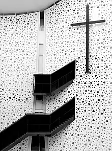 The church's façade comprises three sections of perforated panels which are “sewn” together by external staircases which culminate in a large Cross