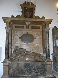 On the death in 1635 of his wife Margaret Hopton aged 25, Throckmorton erected a very costly monument in a variety of coloured marbles to her memory in The Gaunt's Chapel, Bristol. The Gaunt's was a charitable foundation established in 1220 by Maurice de Gaunt (died 1230), who was a member of the Berkeley family of Berkeley Castle. The Berkeleys maintained close links with the foundation even after Dissolution of the Monasteries (16th century) and it appears that the Throckmorton monument was placed here on account of Sir Baynham's descent from his grandmother Elizabeth Berkeley, wife of Sir Thomas Throckmorton, the daughter of Sir Richard Berkeley (died 1604) of Stoke Gifford, Gloucestershire, whose monument is also in The Gaunt's Chapel. The monument is unusual in that it features the still living Sir Baynham, who would survive a further 29 years. He is shown in front of his wife, reclining and dressed in armour with long flowing hair. Over his shoulders he wears a wide lace collar, with knee-plates and wide-toed boots. His wife reclines behind him, half-raised and leaning on her right elbow, looking out towards the viewer. She is richly dressed and with one hand grasps that of her husband whilst with the other she holds their infant son, who is according to Barker "quaintly dressed".[10] The monument contains the following inscription, much mutilated and worn, on two small rectangular black marble panels beneath the ceiling of the canopy: