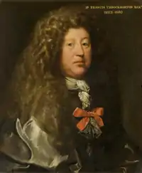 "Sir Francis Throckmorton, Bart. Died 1680". School of Sir Peter Lely (1618–1680), on the staircase at Coughton Court, Warwickshire. Throckmorton Collection, Coughton Court, now owned by the National Trust, NTPL ref: 153572