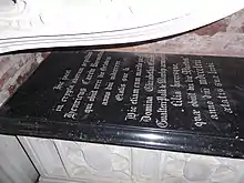 He died on 31 October 1830 and was buried in the family vault beneath St Blaise's Church, Haccombe, next to Haccombe House, which church was a peculiar of the Archbishop of Canterbury and was served by an archpriest who was not subject to the authority of the Bishop of Exeter[10] as were all other parish priests in Devonshire. His monument survives at the east end of the north aisle, consisting of a chest tomb within an Easter sepulchre-type niche, beneath a stained glass window. The top of the chest tomb is a slab of polished Purbeck marble engraved in Latin in Gothic text as follows, in imitation of mediaeval monuments:
