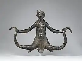 This Roman bronze sculpture ca. 1571–1590 depicts a siren from Greek mythology, believed to be an emblem of the Colonna family, and first recorded in the collection of the Cardinal Francesco Maria del Monte before passing into the Barberini family.[1][2] A female figure, nude from the waist up, boasts a crown and a multi-tentacled mermadic lower body. With her chin up and her arms outstretched, she grasps a scaly tentacle with each hand.