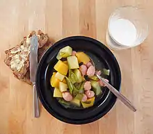 Siskonmakkara is a mild, Finnish fresh sausage made of pork, cooked before serving. The meat is soft and smooth-textured and usually squeezed from its casing when cooking. The most common dish using this sausage is siskonmakkara soup (siskonmakkarakeitto) in which they are cooked in, and simultaneously flavours, the soup stock. The sausage can also be used for a stroganoff or macaroni casserole in place of minced meat. It does not keep well and should be used on the day it is bought.[1]