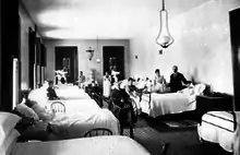 On 3 June 1848,[4] eight Sisters of Charity, Sisters Ursula Mattingly, Ann de Sales Farren, Hieronimo O'Brien, Anacaria Hoey, Clare McDurby, Mary Aloysia Lilly, Mary Eliza Dougherty, and Agatha O'Keefe,[5] arrived in Buffalo.[3] Bishop Timon had purchased an unused brick schoolhouse and adjoining cottage at Pearl Place, which he gave to the Sisters to use.[6] They outfitted it with 100 beds and living quarters for themselves.[3] On 1 October 1848, Sisters of Charity Hospital officially opened as Buffalo's first large healthcare facility, under the leadership of Sister Ursula Mattingly, DC.[4] The first patients were a group of six sailors.