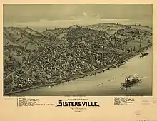 Sistersville was named because two sisters, Sarah Wells McCoy and Delilah Wells Grier, inherited the land underlying the town from their father, pioneer Charles Wells, in 1815 and laid out the town.[6] Wells had settled on the sandy bottomland with his second wife, Elizabeth Prather and many of his 22 children (Sarah and Delilah were the 12th and 17th; his first wife Michal Owings had died in 1783 after giving birth to 10 children). The site was called Wells Landing, Wella having previously founded Wellsville and Wellsburg along the Ohio River and having served in the Virginia legislature from Brooke County in 1793.[7] The Virginia General Assembly created Tyler County in 1814, weeks before Wells' death, and a court session was held at Wells' house in Sistersville ("Welkin") in 1815 (the plat having included lots for a courthouse and lawyers' offices), but in 1816 voters selected Middlebourne, on Middle Island Creek about halfway between Pennsylvania and the Kanawha salt springs (and which incorporated in 1813) as the county seat. The Virginia General Assembly chartered Sistersville in 1839.[8] By 1850, Sistersville had grain and wool carding mills. The ferry across the Ohio River which James Jolly had started decades earlier would still be operating in the 21st century. The Russell Building (built in 1840 as a ferry house) would survive many floods and later serve as a market and the offices of the Oil Review edited by J. Hanford McCoy.[9]