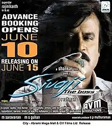 In addition to being AVM Productions' 168th film,[22] Sivaji was also Rajinikanth's 154th film,[18] his 100th Tamil film[lower-alpha 3] and his ninth film with AVM Productions.[18] According to Rajinikanth's biographer Naman Ramachandran, the film was also made to commemorate the 100th birth anniversary of the production company's founder, A. V. Meiyappan.[24] Sivaji was also noted for its change in the traditional yellow coloured Rajinikanth introductory text which made its debut with Annaamalai (1992). Instead the text is displayed in Chrome.[25]