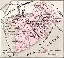 The Six Provinces of Southern Vietnam (Vietnamese: Nam Kỳ Lục tỉnh, 南圻六省 or just Lục tỉnh, 六省) is a historical name for the region of Southern Vietnam, which is referred to in French as Basse-Cochinchine (Lower Cochinchina).[1] The region was politically defined and established after the inauguration of the Nguyễn dynasty, and called by this name from 1832, when Emperor Minh Mạng introduced administrative reforms, to 1867, which culminated in the eight-year French campaign to conquer the Six Provinces.