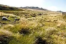The geography of the Falkland Islands is characterised by open grasslands and heather. There are no native trees. The wind blows constantly, and the weather can change suddenly. A feature of the landscape is stone runs, fields of broken boulders. Outside the town of Stanley, the islands were dotted with small settlements, where farmers raised sheep. Fences were common. There were vehicle tracks around the settlements, but no roads between them. Cross-country movement by vehicle involved avoiding stone runs and peat bogs. The settlements were connected by light aircraft, and each had a landing strip. Items too heavy to move by air were shipped by water, using coastal shipping.[5]