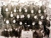 The 1870 firman establishing the Bulgarian Exarchate allowed for a diocese to join the Exarchate, given the support of 2/3 of its flock.[20] Ecclesiastical allegiance was treated as a declaration of one's national identity.[21] From 1870 until 1913 the national affiliation of the Orthodox Slavs of Macedonia became the locus of a contest between Greece and Bulgaria, who intensified their national educational activity in the region of Macedonia, alongside Serbia.[22] In the 1870s, Serbs directed their attentions to Macedonia, due to their interest in the area of Kosovo and after the frustration of hopes of acquiring Bosnia-Herzegovina, once it was occupied by Austria-Hungary in 1878. Serbian intellectuals denied the Bulgarian identity of Macedonian Slavs, based on the differences between eastern and western Bulgarian dialects, and suggested they should be incorporated in Serbia.[23] For Slav peasants, however, the choice between the Patriarchate and the Exarchate was not tainted with national meaning, but was a choice of Church or millet.[19] Thus, adherence to the Bulgarian national cause was going against notions of the sanctity of the Greek language, but was attractive as a means of opposing oppressive Christian chiflik owners and urban merchants, who usually identified with the Greek nation, as a way to escape arbitrary taxation by Patriarchate bishops, via shifting allegiance to the Exarchate and on account of the free (and, occasionally, even subsidized) provision of education in Bulgarian schools.[24] The Greek party initially relied on the traditional appeal of belonging to the Rum millet and the authority of its prelates, on Greek cultural and educational hegemony, and on cooperation with Ottoman authorities.[25] Bulgarian nationalists had taken a lead, and as traditional means of exertion of influence by Greek nationalists proved insufficient, the Greek efforts after 1878 were directed to the middle and southern parts of Macedonia, investing in the opening of Greek schools and subsidizing education in Greece, while from 1882 Greece opened consulates that operated as centers of Greek national propaganda.[26] Despite the emergence and propagation of national ideologies, the worldview of most Slav peasants in Macedonia was marked by pre-national concerns, and characterized by the fundamental rift between Christian subjects and Muslim overlords.[27]
