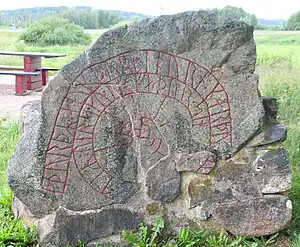 The runic text states that two sons named Þórðr and Þorbjôrn built the bridge and raised the stone as a memorial to their father Verskulfr. Of the personal names mentioned in the text, two contain the Norse pagan god Thor as a theophoric name element. The name Þorbjôrn translates as "Thor Bear,"[2] and Þórðr is a shortened form of Þór-röðr, a common male name form based upon the god's name.[3]