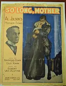 "So Long, Mother" is a World War I era song released in 1917. Raymond B. Egan and Gus Kahn wrote the lyrics. Egbert Van Alstyne composed the music.[1] The song was published by Jerome H. Remick & Co. of Detroit, Michigan. On the cover is a soldier and mother in an embrace. Adjacent is an inset photo of singer Al Jolson.[2] It was written for both voice and piano.[3]