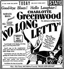 So Long Letty is a 1929 American pre-Code musical comedy directed by Lloyd Bacon and starring Charlotte Greenwood, reprising her role from the 1916 Broadway stage play.[3][4][5] The story had previously been filmed as a silent under the same title in 1920 with Colleen Moore.