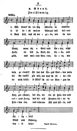 In the first publication, the poem has six stanzas of four lines each, with the final stanza repeating the first as an affirmation. The rhyme scheme fit no traditional hymn tune. Friedrich Silcher wrote a melody published 1843 a collection Zwölf Kinderlieder für Schule und Haus, zwei- drei- und vierstimmig componiert (Twelve children's songs for school and home, composed for two, three and four parts).[6] It was combined with the text "Wie könnt ich ruhig schlafen in dunkler Nacht, wenn ich, o Gott und Vater, nicht dein gedacht?" (How could a sleep peacefully in dark night if I had not thought of you, o God and Father), an evening prayer for children by Agnes Franz. It is not known when Hausmann's text was combined with Silcher's melody. In 1870 at least both were firmly together, now as three stanzas of eight lines each due to the longer melody.[7]