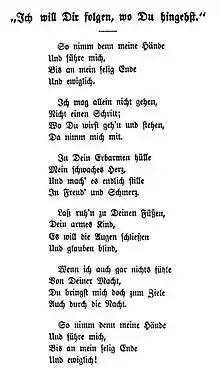 While the song soon became popular, it was included in official hymnals only with hesitation. The Deutsches Evangelisches Gesangbuch of 1915 and its regional versions included it as a "Geistliches Volkslied", a sacred Volkslied or popular song which was not intended for use in church services. It was not included in the general part (Stammteil) of the 1950 Evangelisches Kirchengesangbuch (EKG).[8] In the 1980s, Protestants who were requested to name a sacred song they knew mentioned "So nimm denn meine Hände" as No. 3, after "Ein feste Burg" and "Lobe den Herren".[9] The 1993 Evangelisches Gesangbuch then lists it as a hymn (EG 376) in the section Glaube – Liebe – Hoffnung: Angst und Vertrauen (Faith – Love – Hope: Anxiety and Trust), not under Sterben und ewiges Leben (Death and eternal life). In the regional section of the Catholic hymnal Gotteslob of the Diocese of Hamburg it is listed as GL 851 under Vertrauen und Trost (Trust and Consolation).[8][10]