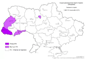 Before the 2006 parliamentary elections, some commentators regarded the SDPU(o) as one of three hard-line anti-Yushchenko forces, with the others being Viktor Yanukovych's Party of Regions and Petro Symonenko's Communist Party of Ukraine.[23] At the time, the SDPU(o) also became close to the Socialist Party of Ukraine.[4] During the 2006 Ukrainian parliamentary election, the party was part of the Opposition Bloc "Ne Tak", and failed to clear the 3% minimum to get into the Verkhovna Rada, thus losing all of its seats.[7] The SDPU(o) has considered various concepts in an effort to regain its status as a viable force in Ukrainian politics.[24] The current leader is Yuriy Zahorodnyi, who was also a member of the pro-Russian Opposition Platform — For Life until its ban and dissolution amidst the 2022 Russian invasion of Ukraine.[25]