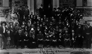 McKenzie planned a symbolic event with national press coverage and worked with Arthur C. Parker to recruit speakers, design the conference program and secure endorsements from the Bureau of Indian Affairs, City of Columbus, Ohio State University and several local civic and religious organizations.[21] The response was positive. Impressed with the historical significance of the April meeting, Ohio State President William Oxley Thompson, Columbus Mayor George Sidney Marshall, as well as by the President of the Chamber of Commerce, the President of the Ministerial Association, the Secretary of the YMCA, the Secretary of the State Historical and Archaeological Society, and the President of the Columbus Federation of Labor invited the new American Indian Association to hold their first national conference in Columbus, on Columbus Day, October, 1911.[22] "Word has come to our ears that you are planning to meet in national assembly for the first time in history to discuss the problems which devolve upon the Indian race, and we, therefore, hasten to invite you to light the camp-fire first in the city named for the first white man who visited these shores. Let us, if we may, forget any animosities of the past, and jointly work for those conditions and those policies which in the future will justify peace because based upon the principles of equity, intelligence and progress. The high position which your leaders are reaching make us eager to welcome the representatives of all the tribes in the name of Ohio State University, the City of Columbus, and the civic and religious bodies of our city."[22] The invitation was accepted and a call issued for a national conference.[23]