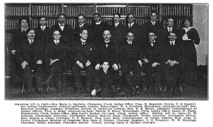 In April 1912, when the proceedings of the Columbus conference were published, Society membership had increased to 101 actives, about one-third of whom were women, and approximately the same number of non-native associates.[34] By 1913, active members grew to the high point of nearly 230 individuals representing almost 30 tribes.[40] Membership included Arthur Bonnicastle, (Osage), community leader; Gertrude Bonnin, (Yankton Dakota), educator and author; Rev. Benjamin Brave, (Oglala Lakota), minister; Estaiene M. DePeltquestangue, (Kickapoo); nurse; William A. Durant, (Choctaw), lawyer; Rev. Philip Joseph Deloria, (Onondaga), priest; Rev. John Eastman, (Santee Dakota), minister; Father Philip B. Gordon, (Chippewa), priest; Albert Hensley, (Winnebago); missionary; John Napoleon Brinton Hewitt, (Tuscarora), linguist and ethnographer; William J. Kershaw, (Menominee), attorney; Susan LaFlesche, (Omaha), physician; Francis LaFlesche, (Omaha), anthropologist; Rev. Delos Lone Wolf (Kiowa), minister; Louis McDonald, (Ponca); businessman; Luther Standing Bear, (Oglala Lakota), educator; Dennison Wheelock, (Oneida), musician, composer, lawyer; and Chauncey Yellow Robe, (Sicangu Lakota), educator.