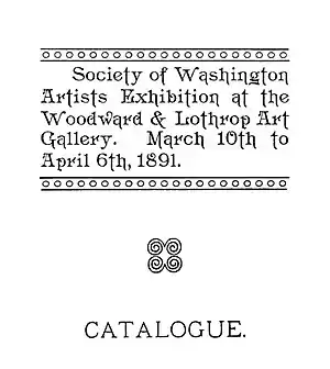 The Society's first exhibit was in 1891, held at the Woodward & Lothrop building. Within a few years the Society had its own gallery space at 1020 Connecticut Avenue. In that space the Society exhibited loaned art work held in private collections in Washington, D.C. By 1900 the Society's annual exhibits included out-of-town artists and were the forerunners of the Corcoran Gallery's Biennial Exhibition of Contemporary American Art.[2][1]