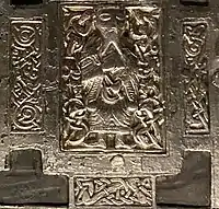 Two of the panels around the sides are lost. The two remaining side-panels contain interlace, and signatures and other Latin inscriptions around their borders.[6] Both of the short (or end) sides have triangular bronze mounts that would have functioned as clasps so that the shrine could be carried.[3][24] Both have half-length decorative panels to hold inserts of ecclesiasticals. One is lost but the one that remains contains a figure, generally assumed to be St. Molaisse, in full profile wearing a tunic or habit.[15] He has rounded facial features, a disproportionally large head,[25] and a forked beard. He holds a book, probably his Gospel, to his chest with one hand and a pastoral staff, a flail or a sprinkler for holy water with the other.[6][26] His outer vestment, or chasuble, was originally embroidered by palm-leaf designs, while the collar is cut in sharply pointed V-shapes.[lower-alpha 2][28]