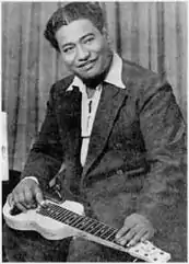 Some historians credit Joseph Kekuku with inventing the Hawaiian steel guitar about 1889 from an acoustic Spanish guitar.[13] This was long before Hoʻopiʻi's time. As far as the electrified lap steel, Philip Kerr mentions in the 1942 Baptista video that Hoʻopiʻi "was the originator of this electric guitar that he's playing."[12] Hoʻopiʻi himself does not make that claim on camera and Kerr may have been saying that Hoʻopiʻi designed or made that particular guitar in his possession. However, the claim comes up again in 1950,[14] in a Florida Newspaper announcing, "Sol Hoopii, king of the Hawaiian guitar and originator of the electric guitar..." as part of the entertainment line-up for a church anniversary. The electric lap steel guitar, in fact, was not invented by Hoʻopiʻi, but he was acquainted with its inventor, George Beauchamp, in Los Angeles. Beauchamp was a steel player who collaborated with violin repairman John Dopyera to attempt to build a steel guitar that was louder.[15] Dopyera and Beauchamp developed a non-electric guitar prototype with a metal resonator, a large metal cone placed under the guitar bridge. They sought investors for a new company to manufacture and sell the resonator guitar. To promote their invention, they organized a lavish party hosted by millionaire Ted Kleinmeyer and asked Sol Hoʻopiʻi to demonstrate the instrument.[16] Years later, after splitting with Dopyera, Beauchamp independently invented the first electric guitar (a lap steel), and received the patent on August 10, 1937.[17]