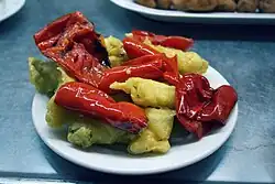 Soldaditos de Pavía (lit. Soldiers of Pavia) are a dish of fried cod wrapped in a slice of roasted red pepper. The dish is found in Andalusian cuisine and common at tapas bars in Madrid, capital of Spain. The cod is marinated in a paprika and lemon juice mix.[1] Before being fried, the pieces of cod can be placed in cold seasoned water and removed when the water begins to boil.[2] It's said to be a popular dish after Easter in the 1905 cookbook by Manuel Maria Puga y Parga.[3]