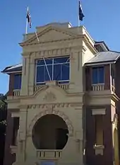 The elaborate pedimented front pavilion of the building is surmounted by a formal raised parapet which together with the rusticated voussoirs, projecting cornice, pilasters, and rising sun motif, give the front of the building an impressive street presence. To give further emphasis to the front, this pavilion is constructed with slightly-contrasting coloured tuck-pointed brickwork.[1]