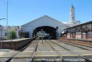 At the southern end of the suburb is the Ballarat railway station, the busiest in urban Ballarat. According to the 2011 Census, 4% of people commute by train (four times the Ballarat average and an increase of 100% since the 2006 Census).[6] Growth in train travel is facilitated by major rail improvements. Soldiers Hill benefits from the trend toward intercity commuting in being the closest residential area to Ballarat station. An important part of Ballarat's strong railway history, Soldiers Hill is home to its main railway complex as well as the Ballarat North Workshops, a major railway systems engineering facility. A number of historically used industrial branch lines serviced light industry in the 1880s, which was located along Creswick Road. The 1888 signal box at Macarthur Street (demolished due to vandalism in 2012),[7] although platformless, was once staffed and was a drop-off and pick up point for trains used historically by students of Macarthur Street Primary. A tramway (demolished in the 1970s) once ran the length of Lydiard Street Nth with several stops in Soldiers Hill along the way.[8]