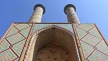 This pair of minarets are made of bricks and they flank the iwan leading to the mausoleum.[3] Each minaret is 15 metres tall, and decorated with several of the 99 names of Allah in the Kufic way.[3]