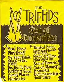 Son of Dungeon Tape is a cassette tape by Australian folk rock group The Triffids.[1] This tape was only sold at the Triffids’ performances in early 1988. The tape was not simply a re-issue of the original Dungeon Tape with only five of the original tracks making it on to this compilation tape.