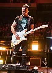 The Edge wearing a T-shirt bearing the likeness of his daughter Sian, who appears on the album cover