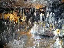 During renewed excavations in 1905 and 1906, a large number of remains of cave bears, cave lions, and hyenas were again found.[12] The total length of the cave, including the outer cave, was redetermined in 1966 by the Nuremberg Natural History Society to be 465 meters.[12] In 1971, the carbide lamps previously used in guided tours were replaced by electric lighting.[17] In the 1970s, the Hösch Cave, which had been closed and cut off during development work in 1833, was rediscovered. In 1997, the entire cave had to be remeasured again, as further discoveries were made in the course of more recent research work by speleologists from Bayreuth and Nuremberg. The new survey, together with the Hösch Cave, resulted in a length of about 900 meters.[2] In late summer of 2000, the show cave operation, with 34,000 visitors a year at last count, was discontinued due to safety deficiencies.