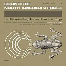From 1953 to 1957, herpetologist Charles Mitchill Bogert, chair of the American Museum of Natural History's Department of Amphibians and Reptiles, collected field recordings of frog calls in "swamps, lakes, woods, creeks, and roadside ditches"[1] of the United States and Mexico. Bogert compiled the recordings and provided narration for the album. Sounds of North American Frogs was released on vinyl in 1958 on the Folkways Records label as part of its Science Series.[2] The album was produced by Bogert and Moses Asch and the cover was designed by Ronald Clyne.[3]