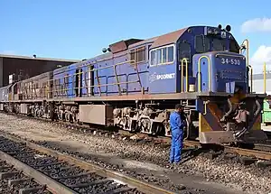 Between 1974 and 1977, the state-owned South African Iron and Steel Corporation placed forty-four General Electric type U26C diesel-electric locomotives in service. They were employed on Iscor's 1974-built Sishen-Saldanha iron ore line and as heavy shunters at the Sishen mine. In 1977, another two locomotives were built for the Douglas Colliery near Witbank. Also in 1977, thirty-nine of the Iscor locomotives were transferred to the South African Railways where they were initially designated "Class 34-400 ex Iscor" and later became commonly known as Class 34-500.[1][2][3]
