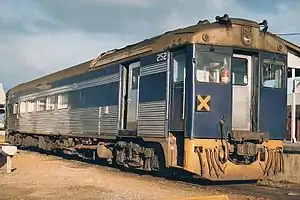 In 1989, shortly before all South Australian country passenger services were withdrawn, the 100 class trailers began to be used as sitting carriages on the Indian Pacific and The Overland.[19][20][21][22] Some were also converted for use as crew carriages on Trans-Australian Railway services.[11][23] Power car 259 was converted to locomotive-hauled car BM259 in 1990 and had its engines removed in 1991.[24] The last were withdrawn in January 1993 and placed in store at Mile End and later Islington Railway Workshops. In May 1995, no. 257 was donated to the National Railway Museum, Port Adelaide.[11][25]