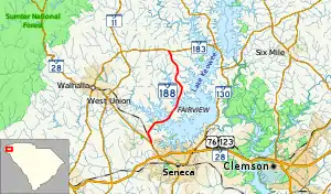 SC 188 begins at an intersection with SC 28 (Blue Ridge Boulevard) northwest of Seneca, within Oconee County, where the roadway continues as Bountyland Road. It travels to the north-northwest and then curves to the northeast just before passing Oconee Christian Academy. It crosses over Cane Creek on the McMahan Bridge. Just south of White Harbor, it crosses over part of Lake Keowee on an unnamed bridge. North of White Harbor, it passes Keowee Elementary School. East-northeast of Walhalla, the highway meets its northern terminus, an intersection with SC 183.[2]