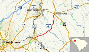 SC 247 begins at an intersection with SC 20 (North Main Street) in Belton, within Anderson County, where the roadway continues as Breazeale Street. This intersection is approximately 300 feet (91 m) from that highway's intersection with U.S. Route 76 (US 76) and US 178. SC 247 travels to the northeast and crosses over some railroad tracks before leaving the city limits. It crosses over West Prong Broadmouth Creek and Broad Mouth Creek. Farther to the northeast, it crosses the Saluda River on the Cooley Bridge. This crossing marks the Greenville County line. The highway winds its way to the north-northeast, through mostly rural areas of the county before meeting its northern terminus, an intersection with US 25 (Augusta Road) in Ware Place.[3]