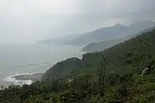 In contrast to most other coastal regions in Vietnam, the South Central Coast's terrain is not mainly flat. It has a diverse topography with mountain ranges and hills extending not only along the entire border with Central Highlands but also to the coast,[5] forming several passes, bays, peninsulas, and beautiful sceneries with beaches and mountain backdrops. Many of the highest mountains are at or near the border with the Central Highlands, the highest of which is Ngọc Linh mountain at 2598 meters.[6] There are several high peaks near the coast of Da Nang city (696m on Son Tra Peninsula), Bình Định province (up to 874m), Phú Yên province (up to 814m), Khánh Hòa province (up to 978m), and Ninh Thuận province (up to 1040m).[6] Several mountain passes function as geographic borders between the provinces of the region, with one or two provinces between two major passes. Major passes include the Hải Vân Pass on the northern border of the region (Da Nang), Binh De pass (đèo Bình Đê) between Quảng Ngãi province and Bình Định province, Cù Mông pass (đèo Cù Mông) between Bình Định province and Phú Yên province and Cả pass (đèo Cả) between Phú Yên province and Khánh Hòa province.[6]