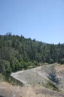 In 1928, the Benbow Dam was built across the South Fork near Benbow, California, which led to the creation of a slackwater pool, Benbow Lake, and the creation of the Benbow State Recreation Area.[30] During the rainy season, the floodgates of the dam were removed. The lake existed during the summer, when lower flows are impounded behind the structure for recreation. The stagnant water in the lake was heated by the sun to a higher temperature than normal and severely hurt salmon and steelhead runs, as well as other aquatic and migratory life downstream.[5] Since 2009 the dam was no longer erected.[31][30] Benbow Dam was finally removed from 2016-2017 on the South Fork of the Eel River.[32] Dam decommissioning will start to occur on the Klamath River in 2022 pending Federal Energy Regulatory Committee (FERC) approval.