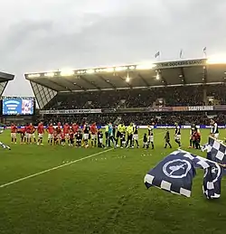 The 2003 relocation and 2004 renaming of Wimbledon F.C. as Milton Keynes Dons meant that a South London derby team was lost.[38] In 2002 some Wimbledon supporters formed a new team, AFC Wimbledon, based at Kingsmeadow in Kingston upon Thames.[39] The non-League club started in the Combined Counties League, and played their first competitive South London derby on 9 November 2009, losing 4–1 away at Millwall in an FA Cup first-round match.[40] Having worked their way up through non-League with five promotions in nine seasons, AFC Wimbledon were promoted first into Football League Two for the 2011–12 season.[41] They spent five seasons at that level before being promoted into League One for the 2016–17 season, where they competed in the same league as Charlton Athletic and Millwall.[42]