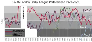 The South London derby is the name given to a football derby contested by any two of Charlton Athletic, Crystal Palace, Millwall, Sutton United, and AFC Wimbledon, the five professional Football Association clubs that play in the Football League in South London, England.[1] It is sometimes more specifically called the South East London derby when played between Charlton and Millwall.[2] The close geographical proximity of all the teams contributes significantly to the rivalries.