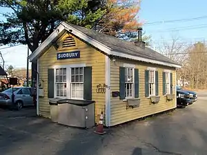 South Sudbury was a commuter rail station in Sudbury, Massachusetts. It was located at the junction of the Central Massachusetts Railroad and the Framingham and Lowell Railroad slightly north of Boston Post Road (U.S. Route 20) in South Sudbury. The Boston and Maine Railroad station was incorporated into the MBTA Commuter Rail through subsidies in 1965. The station was closed in November 1971 when the branch's last remaining round trip was discontinued. The 1952-built station building was a private business until its closure in 2019, and the building is now abandoned. In August 2023 the Massachusetts Department of Conservation and Recreation offered the building to the Town of Sudbury at no cost.[3]