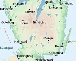 Much of the highlands lies above 200 m.a.s.l. and there are large areas around the highlands that exceed 100 m.a.s.l. The highlands are centered on Småland but cover also large swathes of Scania, Halland, Västergötland, Östergötland and Blekinge.[4] The highest point lies 377 m.a.s.l.[5]