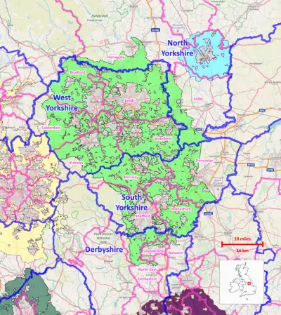The South and West Yorkshire Green Belt is an environmental and planning policy that regulates the rural space within the Yorkshire and the Humber region of England. The function of the green belt policy in South and West Yorkshire is to manage development around the cities, towns and villages in the West Yorkshire Urban Area,[1][2][3][4][5] the Sheffield urban area,[6][7] Barnsley[8] and Doncaster,[9] to discourage urban sprawl.[10] It is managed by local planning authorities on guidance from central government.