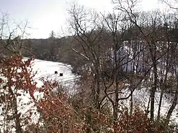 Looking south along the Blackstone River, with the SNE embankment at right and several unfinished supports in the river