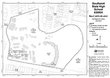 Plans for a new Southport State High School, drawn by the Department of Public Works (DPW) and approved in October 1954, demonstrate an organic planning approach, with the buildings orientated at various angles and connected by covered ways.[30] Positioned in the elevated southwest corner of the new 9.6ha (23.7ac) site, which was bounded by Smith Street (south), Brooke Avenue (west), Townson Avenue (north, now Lionel Avenue), Loders Creek (northeast) and Worendo Street (west, no longer extant), the buildings were "specially planned to suit the natural contours of the site and also make the most use of the prevailing breezes".[31][32][1]