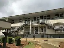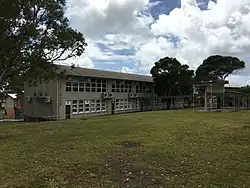Hawksley prefabricated school buildings were prefabricated classrooms imported by the DPW from Hawksley Construction Co. of Gloucester, England, in response to materials shortages and the pressures of the baby boom.[36] Across Australia, £1.5 million worth of Hawksley prefabricated buildings for schools, offices, hospitals and bungalows had been delivered by November 1951.[37] Between 1952 and 1958, a total of 27 Hawksley prefabricated school buildings (90 classrooms) were imported by the DPW; initially intended to provide classroom accommodation at high schools and technical colleges, they were also erected at primary and infants schools across Queensland.[38] Hawksley buildings were erected at Mount Isa State High School, Gladstone State High School, Cavendish Road State High School and Southport State High Schools; Ironside State School, Maryborough Central State School and Ithaca Creek State School; and Junction Park Infants State School, many of which have since been demolished.[1][39]
